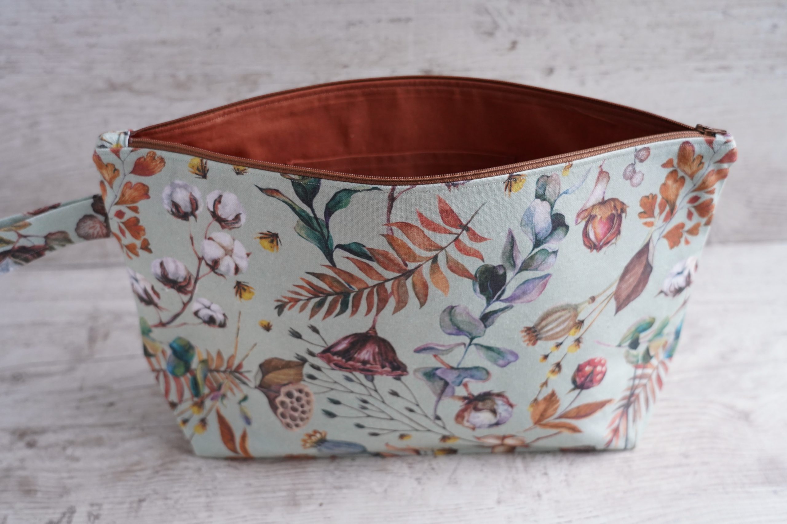 Kuivatut kukat- kuosi , puuvillapolyesterisekoitekankaasta (80% puuvilllaa, 20% kierrätyspolyesteriä) vaaleanruskea puuvillavuori