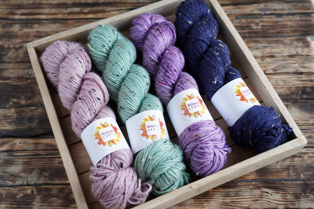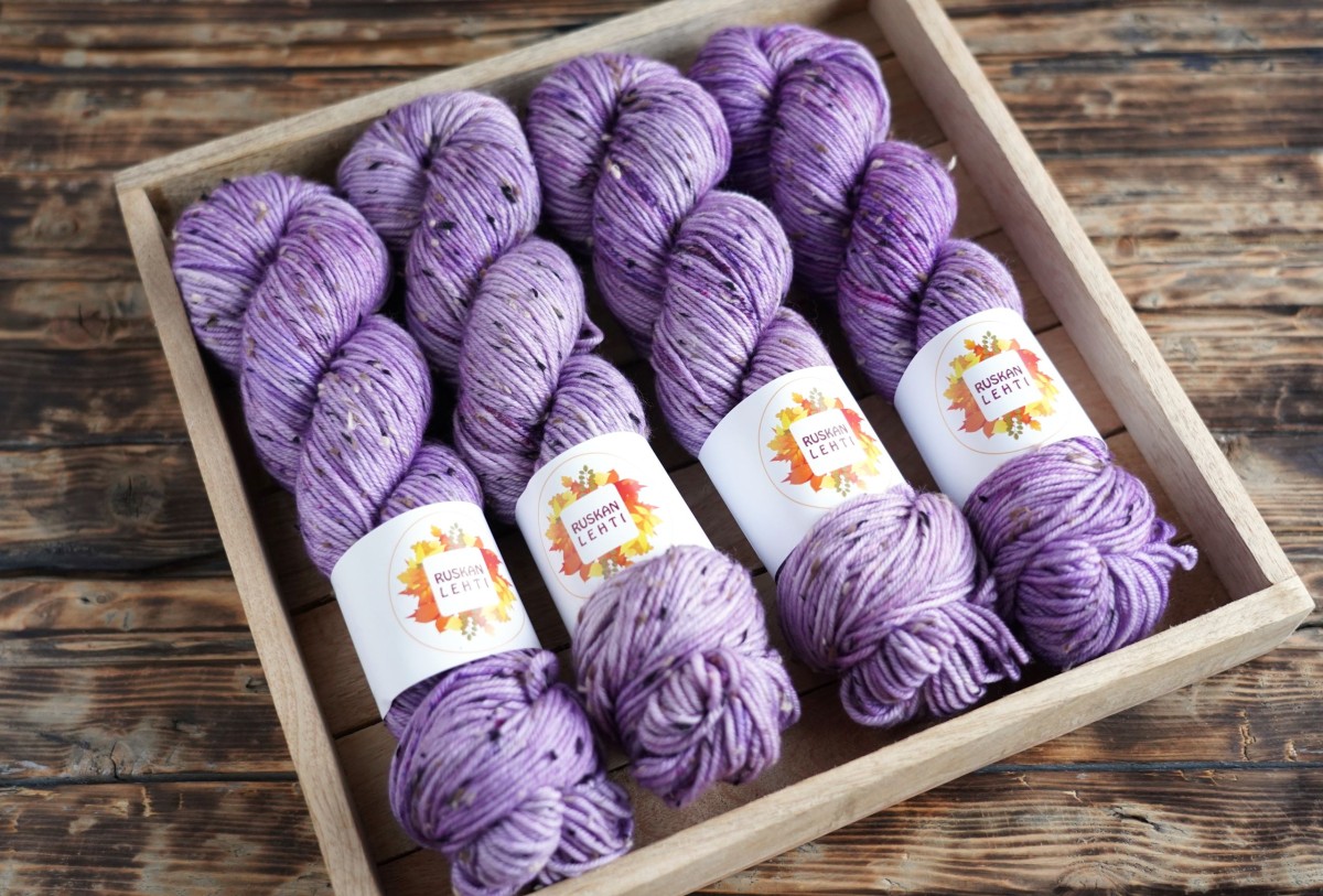 Käsinvärjätty DK vahvuinen merinolanka, jota elävöittävät tweed efektin luovat viskoosinypyt.