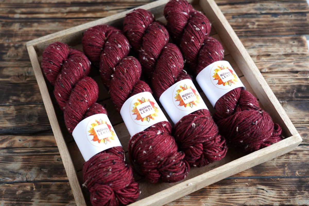 Käsinvärjätty DK vahvuinen merinolanka, jota elävöittävät tweed efektin luovat viskoosinypyt.
